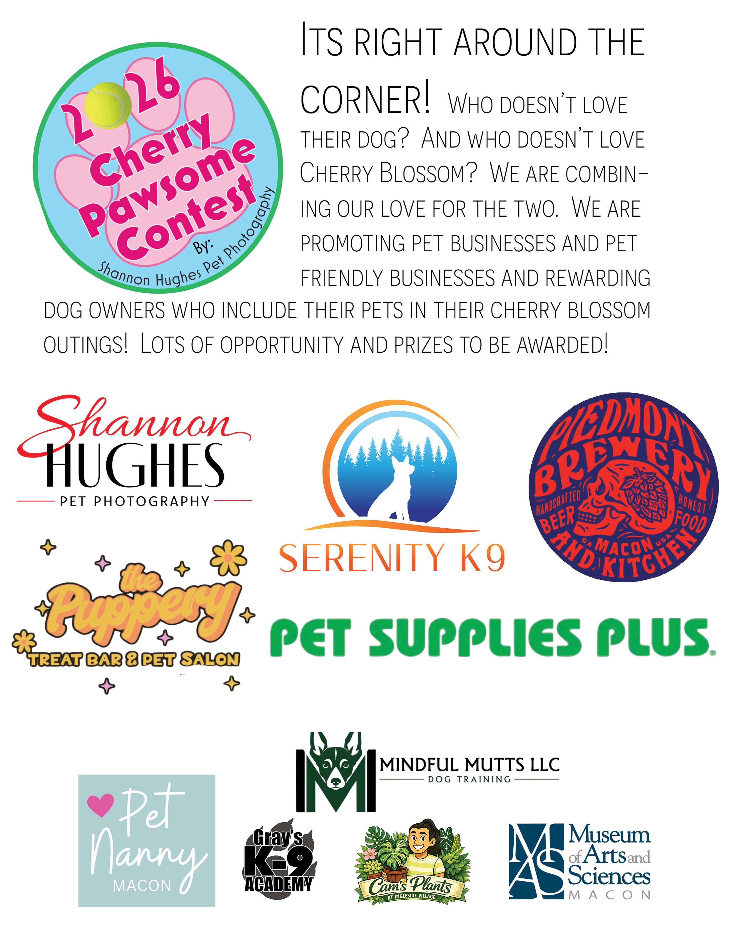 The Cherry Pawsome Contest is a community-wide pet celebration happening during Macon’s Cherry Blossom season! Pet owners enter by visiting participating pet-friendly businesses to obtain an official contest bandanna, then our “Cherry Pawsome Ambassadors” will be out around town surprising participants with prize certificates. Winners redeem their prizes during festival week — driving fun, foot traffic, and local support for Macon’s pet-loving businesses. 🌸🐾 Our sponsors are listed below - please go give them some love!