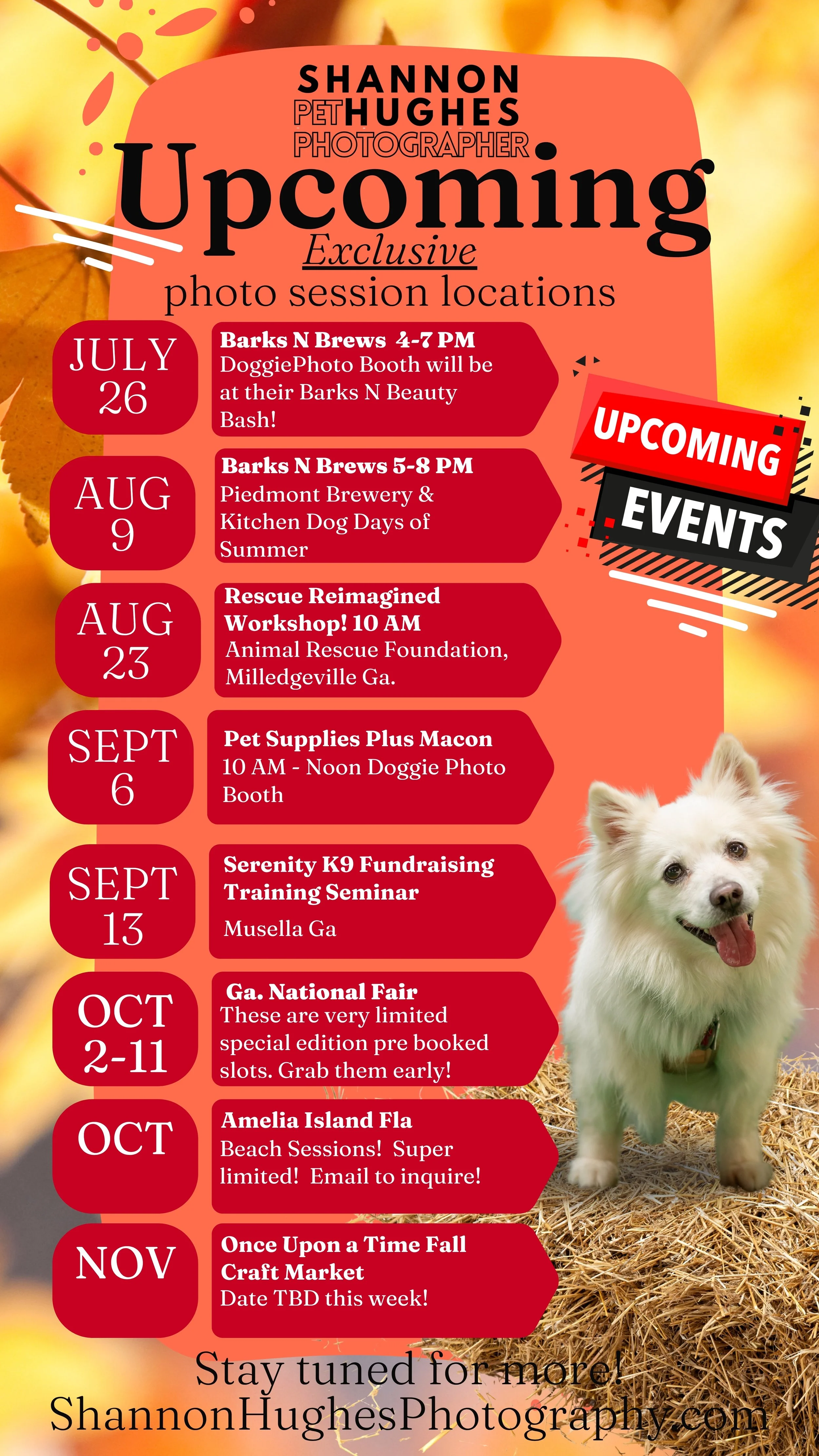 September 6 - Pet Supplies Plus in Macon with my Doggie Photo Booth! One complimentary image per pet with a purchase and donation of dog/ cat food that will be donated to a local rescue!